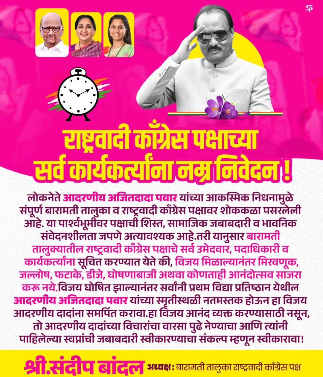 येत्या निवडणूक निकालांच्या पार्श्वभूमीवर विजय मिळाल्यास मिरवणूक, जल्लोष, फटाके, डीजे, घोषणाबाजी किंवा कोणत्याही प्रकारचा आनंदोत्सव साजरा करू नये, असे निर्देश देण्यात आले आहेत. विजय घोषित झाल्यानंतर सर्वांनी प्रथम विद्या प्रतिष्ठान, बारामती येथे आदरणीय अजितदादा पवार यांच्या स्मृतिस्थळी नतमस्तक होऊन हा विजय त्यांना समर्पित करावा, असे आवाहन करण्यात आले आहे.